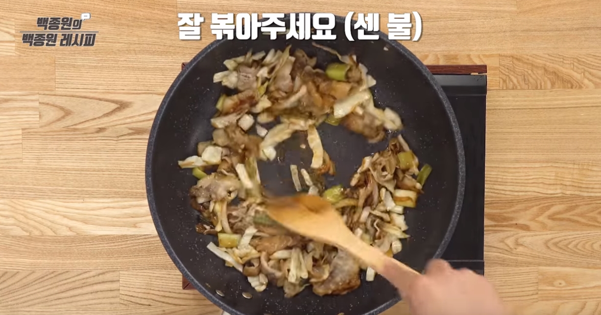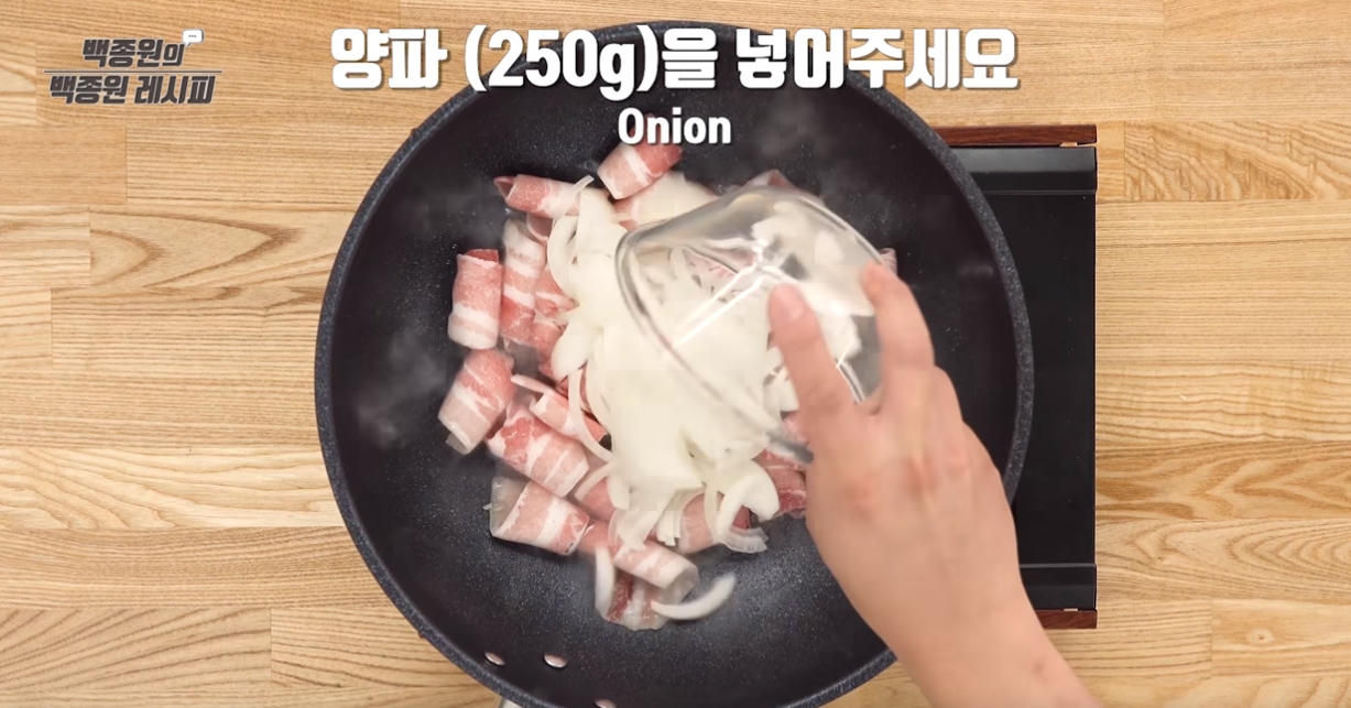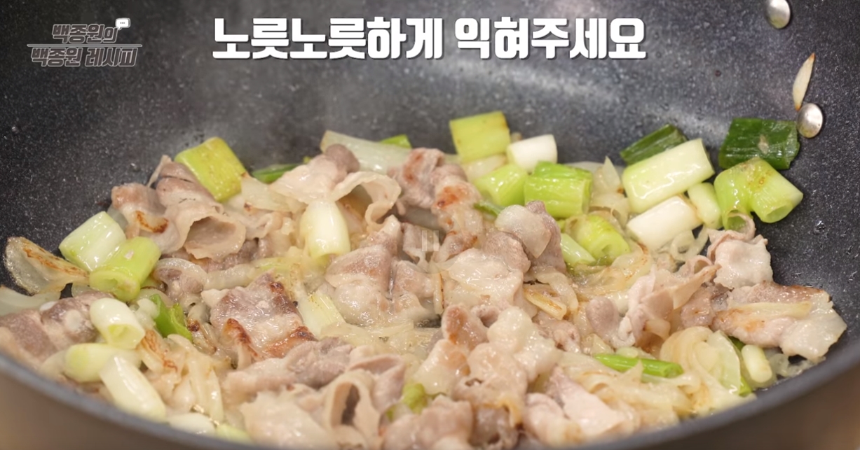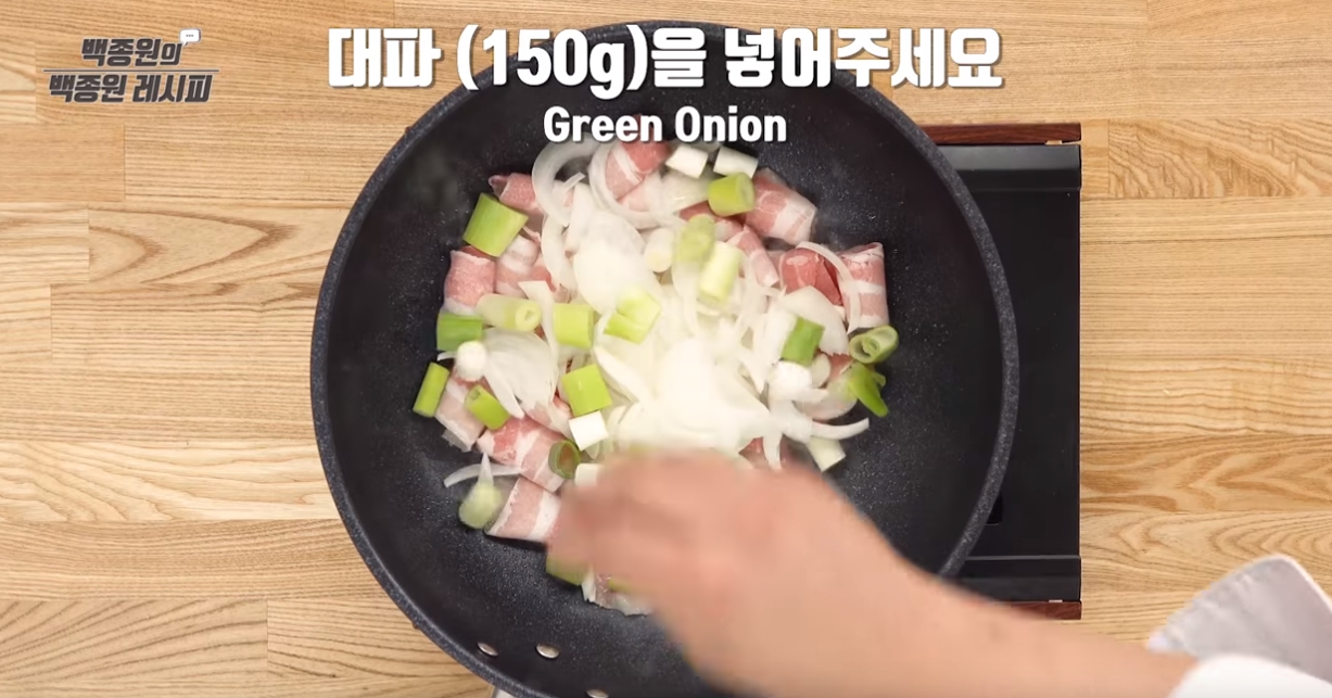대패 삽겹살을 넣고 대파,와 양파를 넣고 센불에 노릇느릇하게