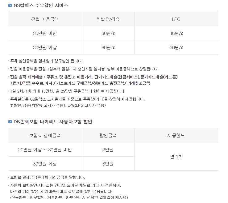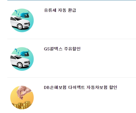 주유할인,다이렉트 자동차보험할인이 있습니다.