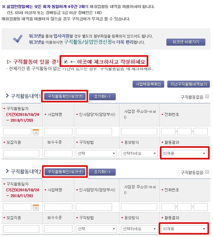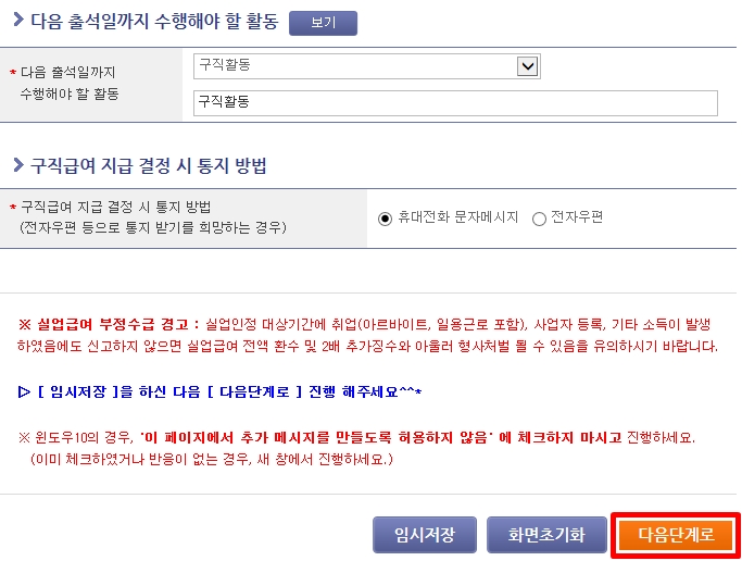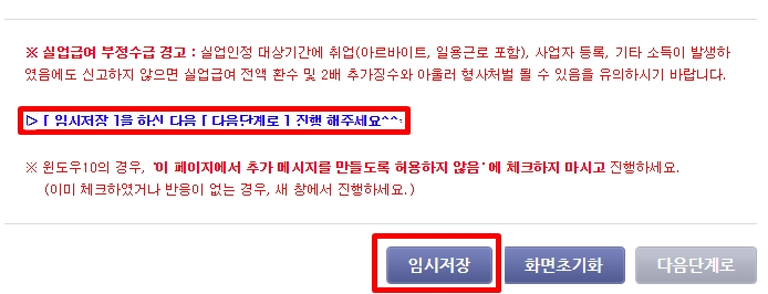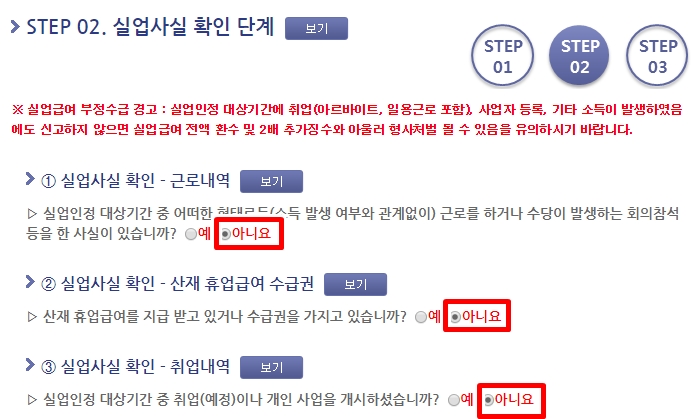 실업 사실 확인단계를 자세히 읽어 보신후 아니요를 모두